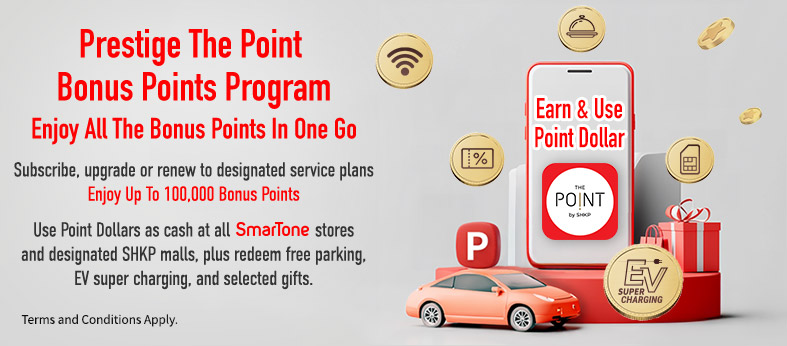 SmarTone Stores and designated SHKP malls. You can use the Point Dollar not only to pay for your mobile or 5G broadband monthly bill, or to purchase roaming services, handsets and accessories, but also to redeem free parking, EV Super Charging, coupons or other selected gifts from The Point App!