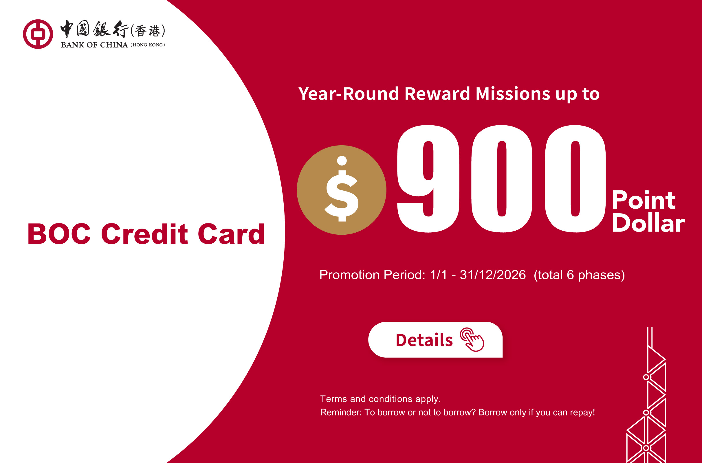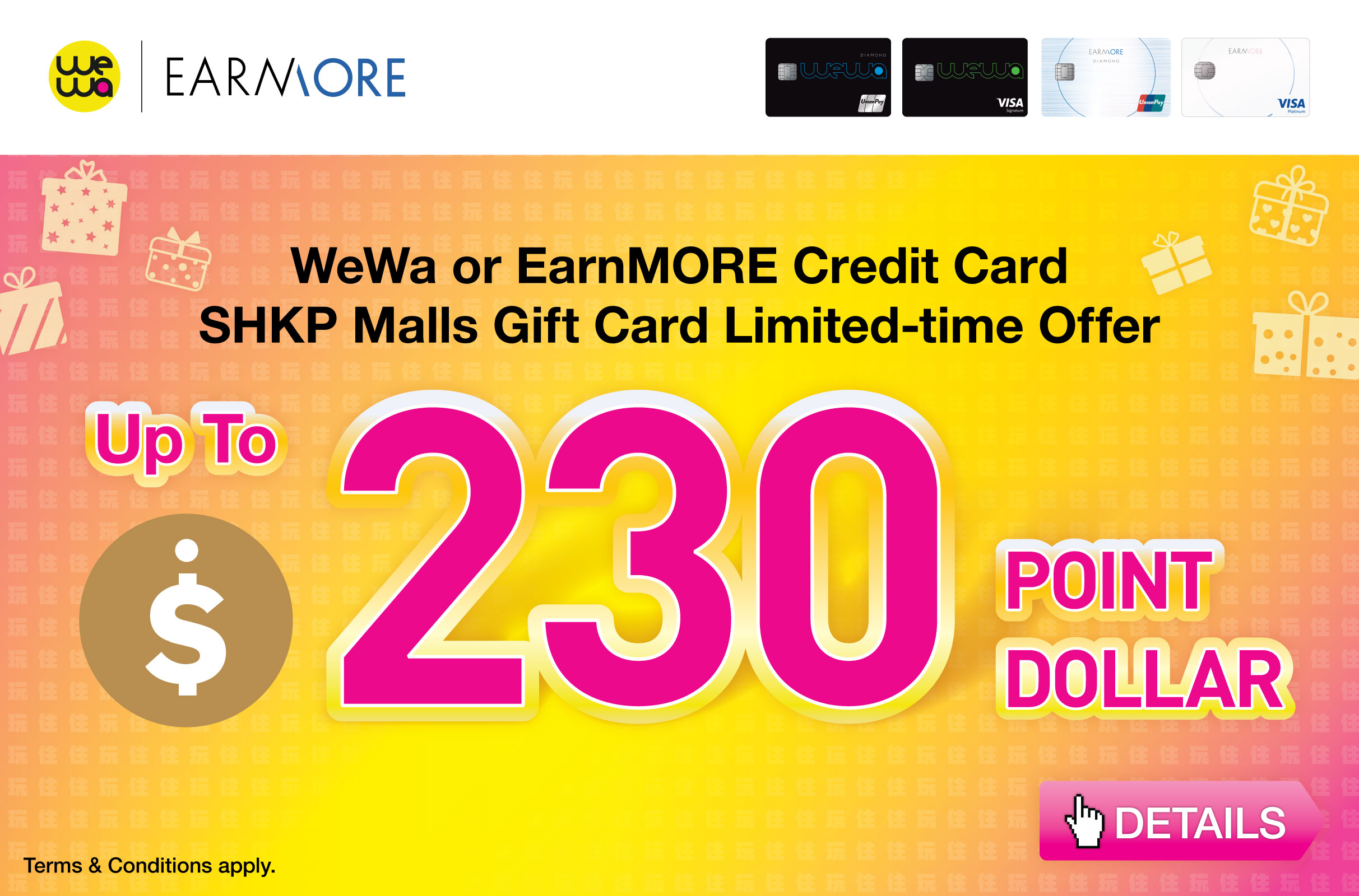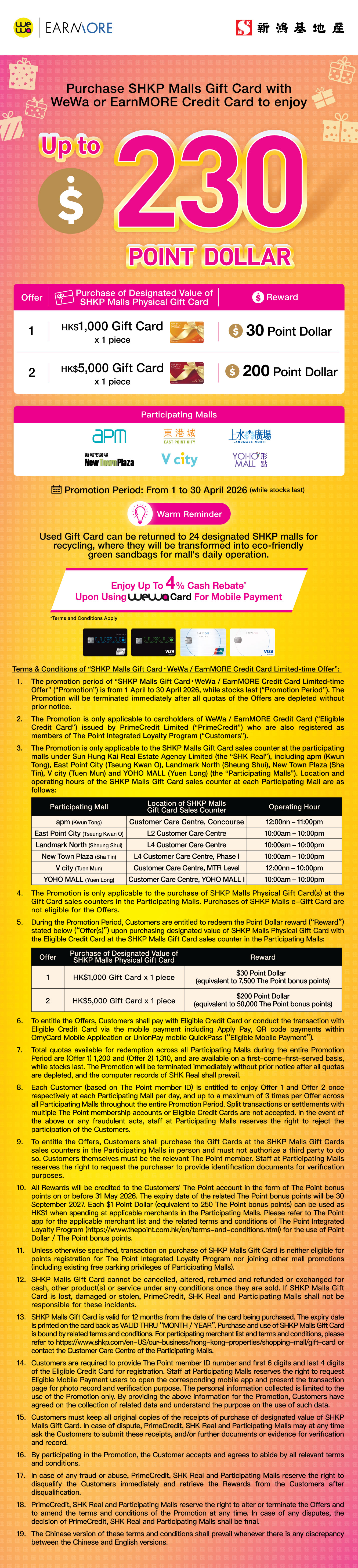 Redemption method: Cardholder must present the original copies of valid machine-printed merchant sales invoices and the corresponding sales slips, together with the eligible Credit Card bearing the same credit card number in person at the designated registration location and time at the Participating Mall, where the transaction is made on the transaction day for e-stamp registration. The offer is not applicable to “Instant Point Earn Service” at designated merchants and points registration via YATA / SmarTone Plus members’ “Auto-earn The Point Bonus Points” function.