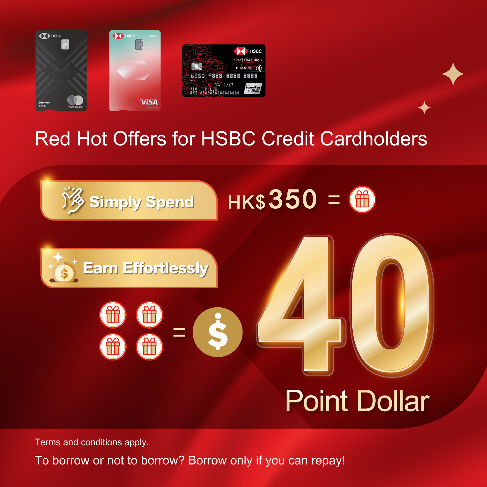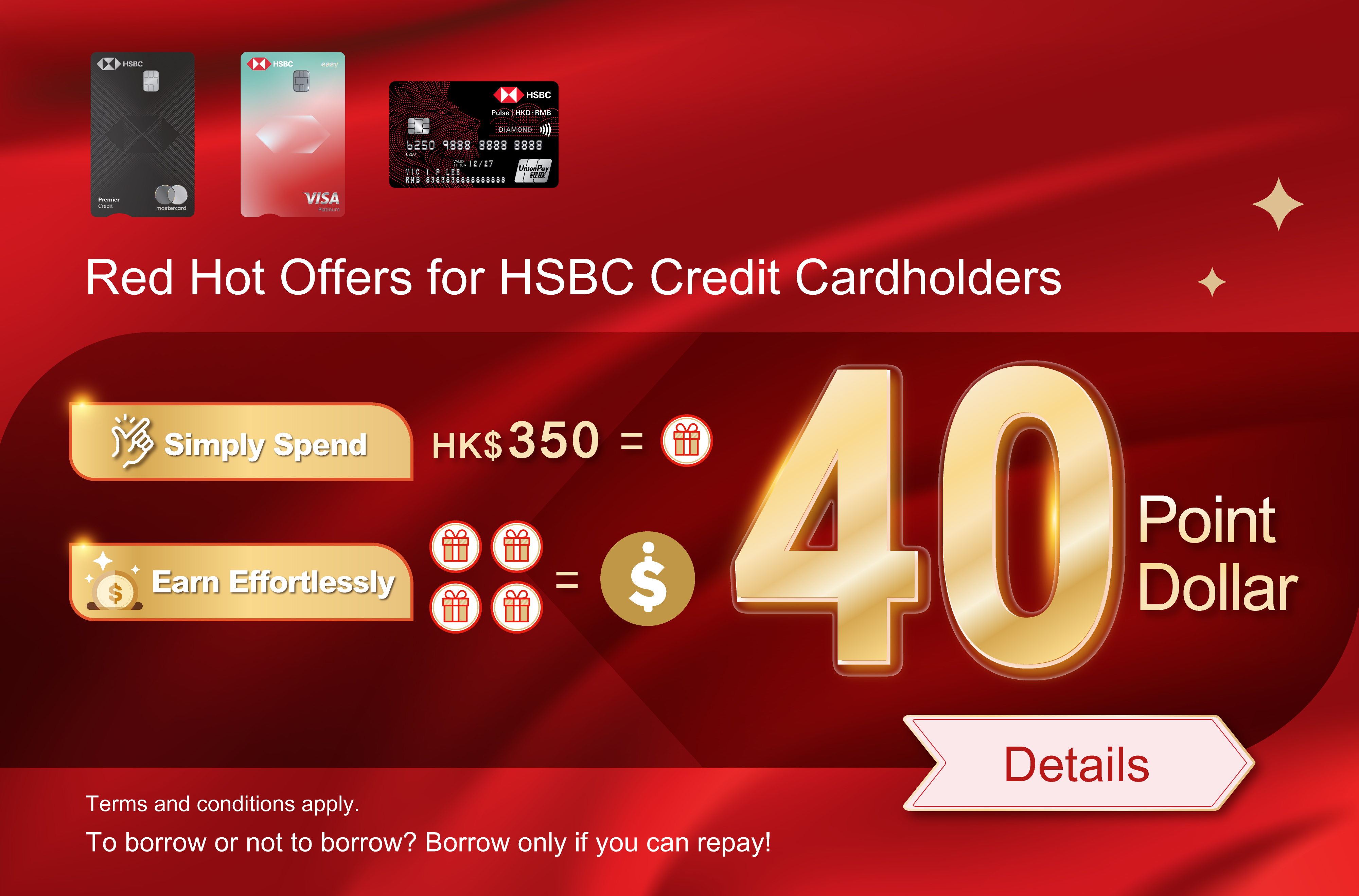 The Point Member is entitled to earn 1 e-stamp upon a same-day single net transaction of HK$350 or above by HSBC Credit Card at “Instant Point Earn” participating merchants. Every 4 e-stamps collected during each phase (i.e. a total of HK$1,400 for 4 transactions) to redeem $40 Point Dollar.