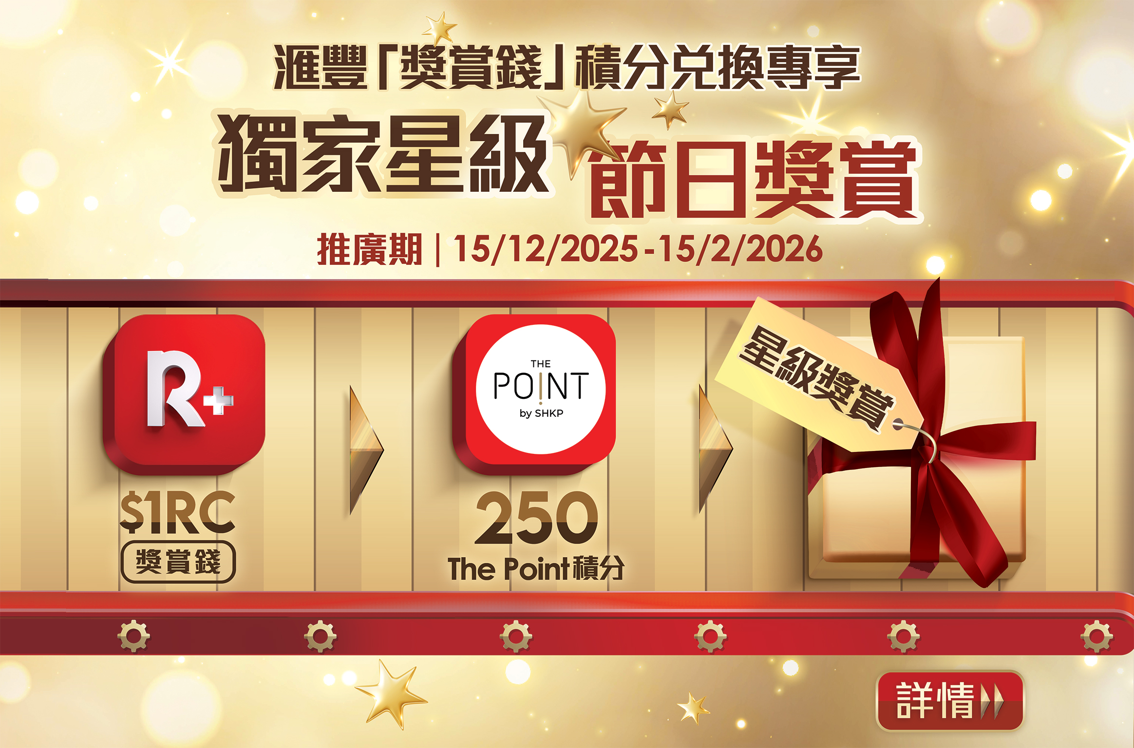 The Point會員憑滙豐信用卡於場內之「即賺分」參與商戶即日單一簽賬淨額滿港幣350元,可獲取1個電子印花,於每個階段之推廣期每收集滿4個印花(即4次簽賬合共低至港幣1,400元),即可換領$40 Point Dollar